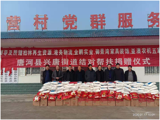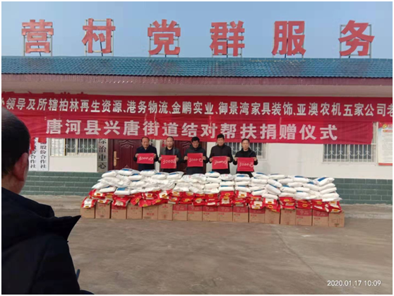 捐贈(zèng)儀式上產(chǎn)業(yè)集聚區(qū)黨委書記劉清文、主任李國(guó)營(yíng)代表興唐街道黨委、政府向五家企業(yè)的義舉表示感謝。他指出,以亞澳農(nóng)機(jī)為首的這五家公司,在完成自身企業(yè)負(fù)責(zé)包片貧困村脫貧的基礎(chǔ)上,還能再拿出現(xiàn)金3000元捐資扶貧,將自己的社會(huì)責(zé)任意識(shí),由助力脫貧攻堅(jiān),走向現(xiàn)在回饋社會(huì)。代表著我縣企業(yè)經(jīng)營(yíng)由起步走向成熟。他希望廣大困難群眾正確面對(duì)暫時(shí)的困難,樹(shù)立戰(zhàn)勝貧困、走出困境的信心和勇氣,發(fā)揚(yáng)自力更生、艱苦奮斗的精神,不等不靠,在黨委、政府和社會(huì)各界的支持和幫助下,以自身的努力和實(shí)干來(lái)化解生產(chǎn)、生活中的各種困難,為構(gòu)建美麗和諧的新唐河作出自己的貢獻(xiàn)。